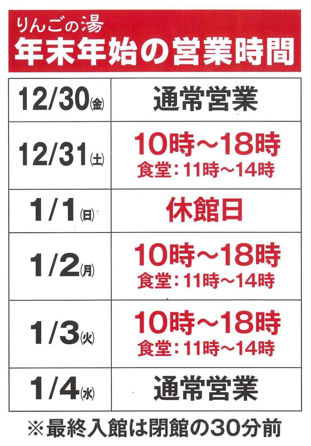 年末年始の営業時間のご案内 いつも豊野温泉りんごの湯をご利用いただきましてありがとうございます。 年末年始は大変混雑しますのでお時間に余裕を持ってお越しくださいませ。入館制限をかける場合もございますご了承ください。 一覧へ